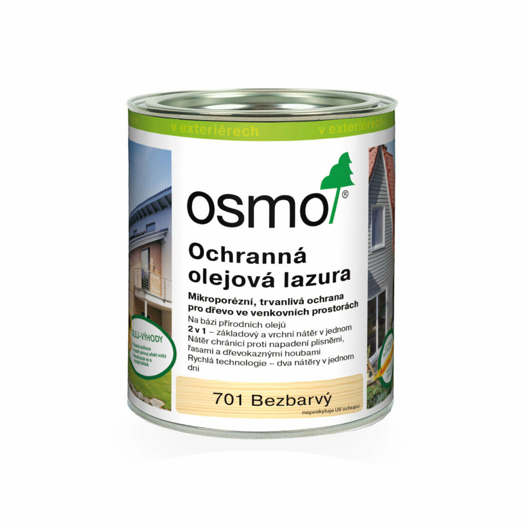Osmo Ochranná olejová lazura je matný ochranný vrchní nátěr na olejové bázi pro dřevěné prvky v exteriéru. Mikroporézní a prodyšnýsvrchní nátěr umožňuje dřevu dýchat a snižuje nebezpečí bobtnání a smršťování dřeva. Odolný vůči vodě i nepříznivým povětrnostním podmínkám. Obsahuje aktivní složky pro ochranu vrchního nátěru před