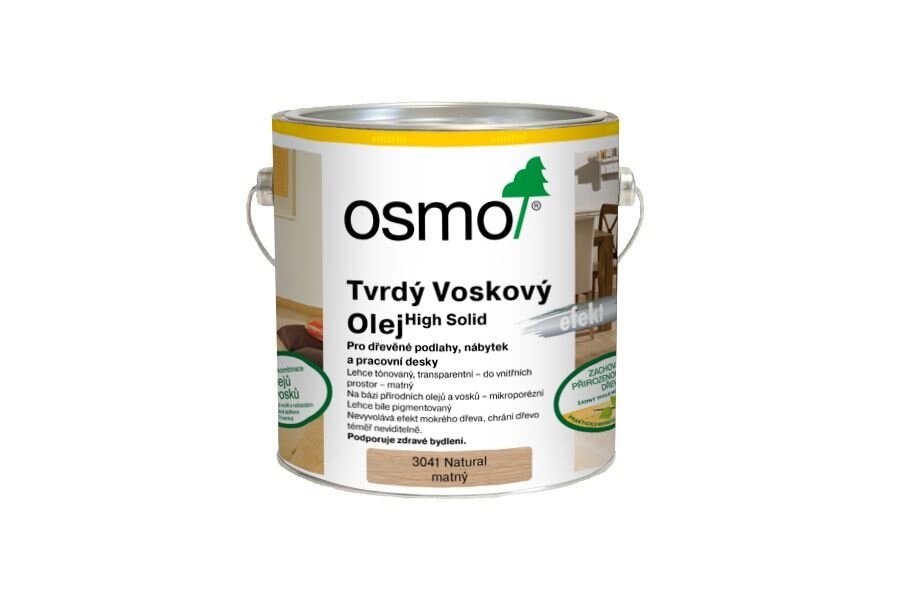 prostředku. Plocha ošetřená Osmo Tvrdým voskovým olejem Barevným Natural odpuzuje nečistoty a vodu, je odolná vůči otěru a je příjemná na dotyk. Díky malému obsahubílých
