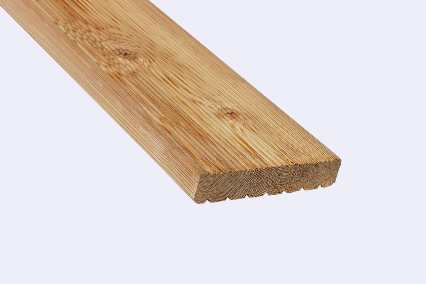 Hoblovaná tesasová prkna se zakulacenou hranou. Jedna strana jemná drážka, druhá strana hrubá drážka. Dřevina sibiřský modřín.